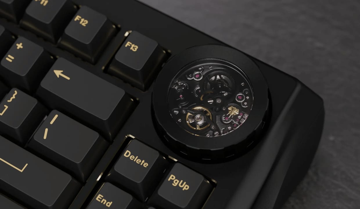 → Next up is an exquisite keyboard from Wuque Studio called Nama, with a sculpted aluminum case and a very special knob featuring a Tourbillon movement engine inside. This type of engine is often included in high-end watches, and is typically exposed to view the intricate inner workings of the time-keeping mechanism. In this board, it is included (and on display) so you can constantly view the rhythm of this piece, without worrying about the time—keeping you in the present and “the master of your own moment”. Definitely not for everyone, but super special as a collector's item.